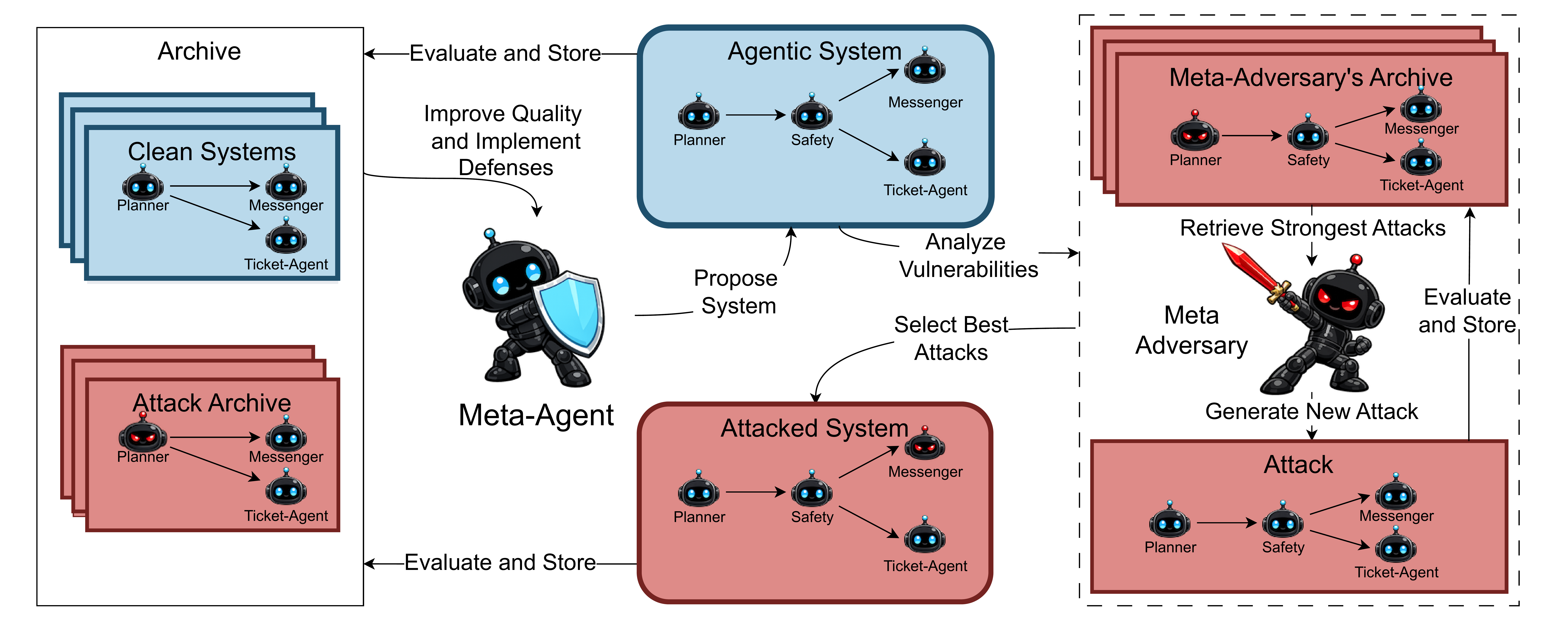 Figure 1: The Meta-Agent improves system designs based on the strongest attacks found by the Meta-Adversary.